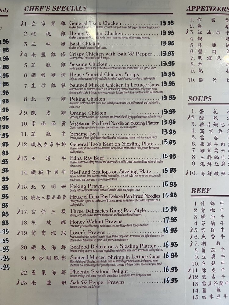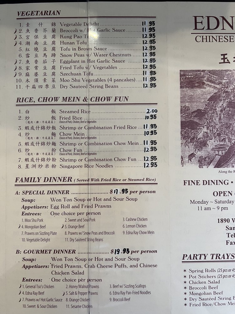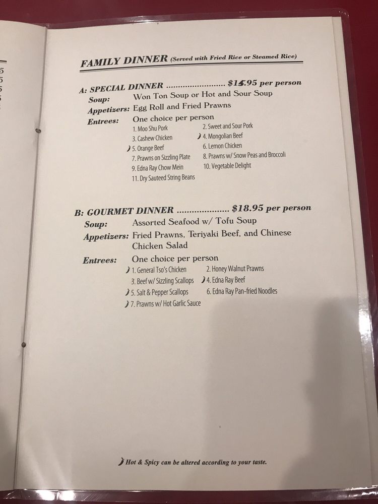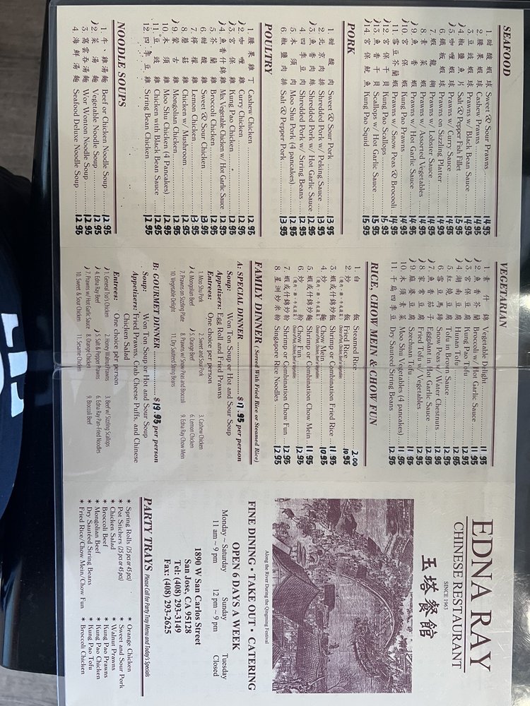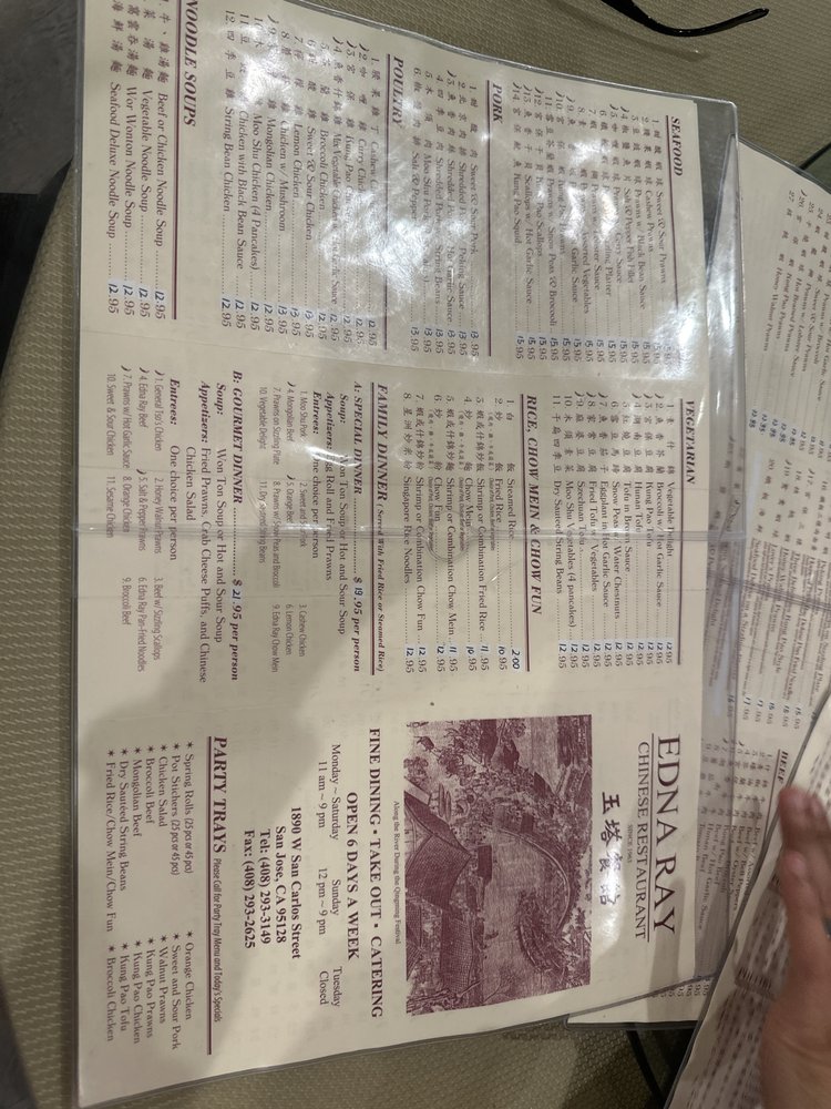Introducing Edna Ray, a Chinese restaurant located in San Jose, CA, known for its extensive menu and excellent service. With a focus on traditional Chinese cuisine, Edna Ray offers a variety of appetizers like Fried Won Tons and Egg Rolls, savory soups like Hot & Sour Soup and Egg Flower Soup, and Chef's Specials like General Tso's Chicken and Honey Walnut Chicken.