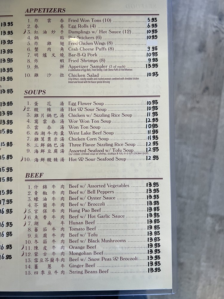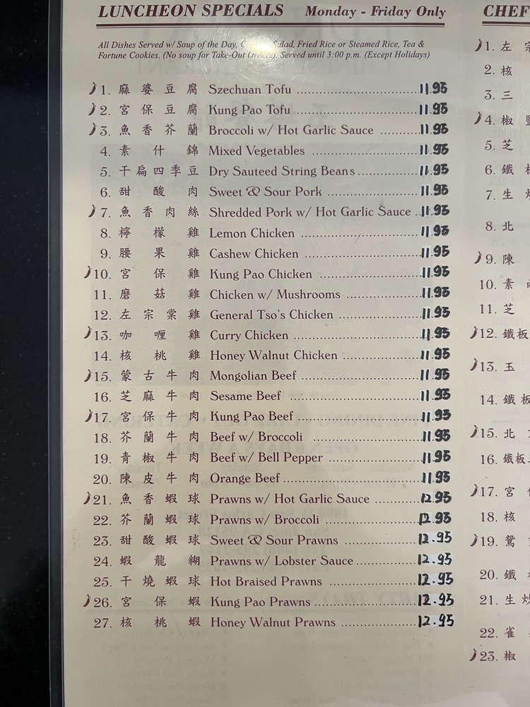 For 1. Your choice of soup won ton soup or hot and sour soup with appetizers, fried prawns, crab cheese puffs, and Chinese chicken salad and your choice of entrees.